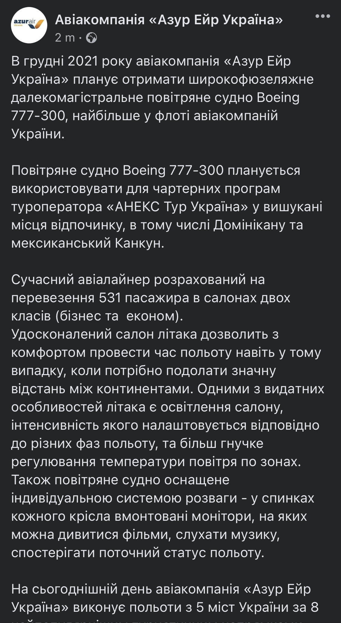 Я не дуже розумію їх логіку: брали 777 для дальніх перельотів типу Канкун та Варадеро, а ставлять його в Хургаду :facepalm: Лише сьогодні виконують перший рейс в Канкун на ньому.
