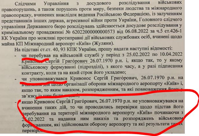 Там написано у листі про "можливі протиправні дії військових службових осіб щодо майна аеропорту".