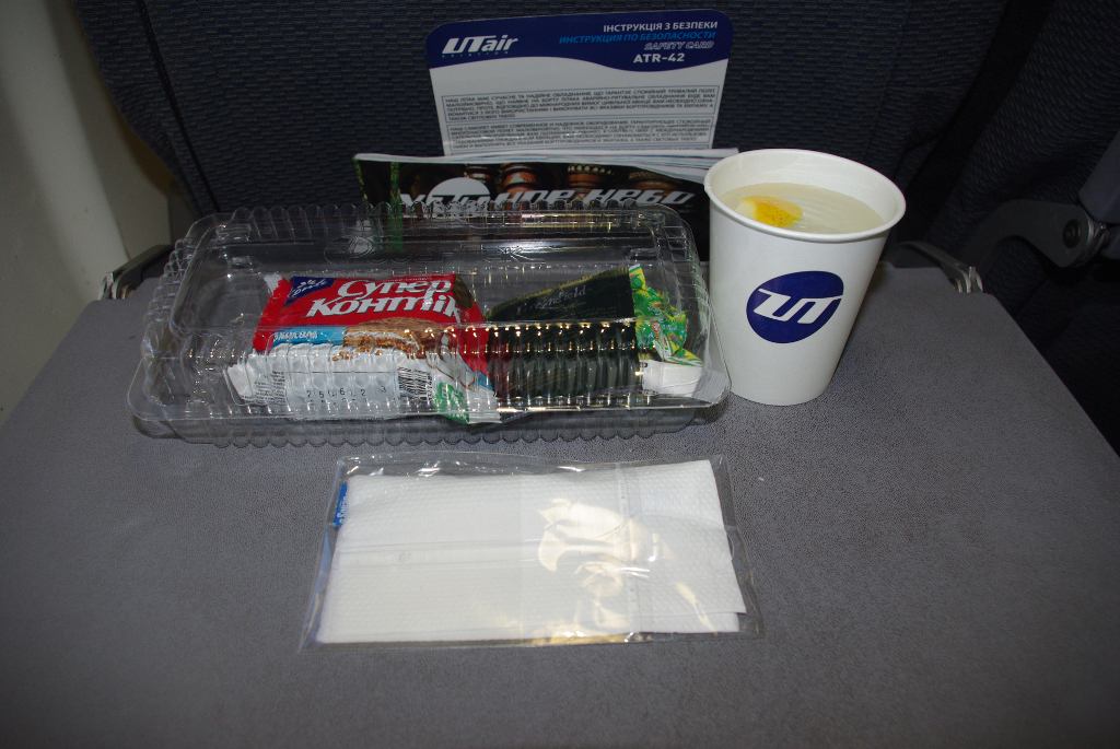 На снідок було запропоновано чай, соки (томатний, яблічний і апельсиновий) та воду. І печиво. Я вибрав чай. Бортпровідник запропонував також лимон. Що само по собі рідкість. Не пригадую коли на борту пропонували лимон до чаю.