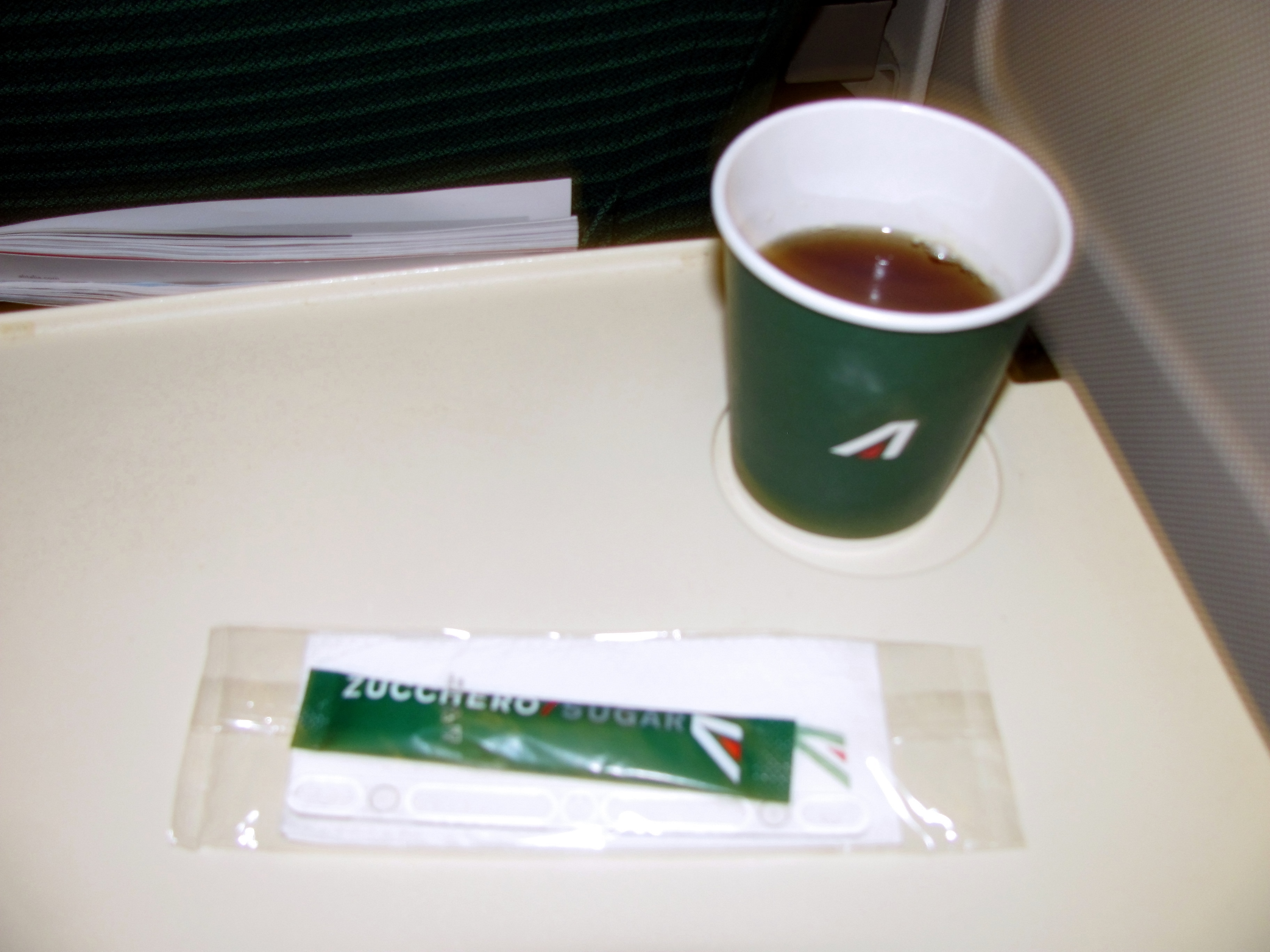 Кормёжка - невкусная и холодная. Как закуска был какой-то салат с курицей, а как основное блюда дали ледяной "Цезарь". По состоянию видно, что везли еще из Рима, а не заказывали в Шереметьево. Из напитков минералка, сок из сицилийского красного апельсина (ужасная гадость - кислый и синтетический), красное и белое вино.
