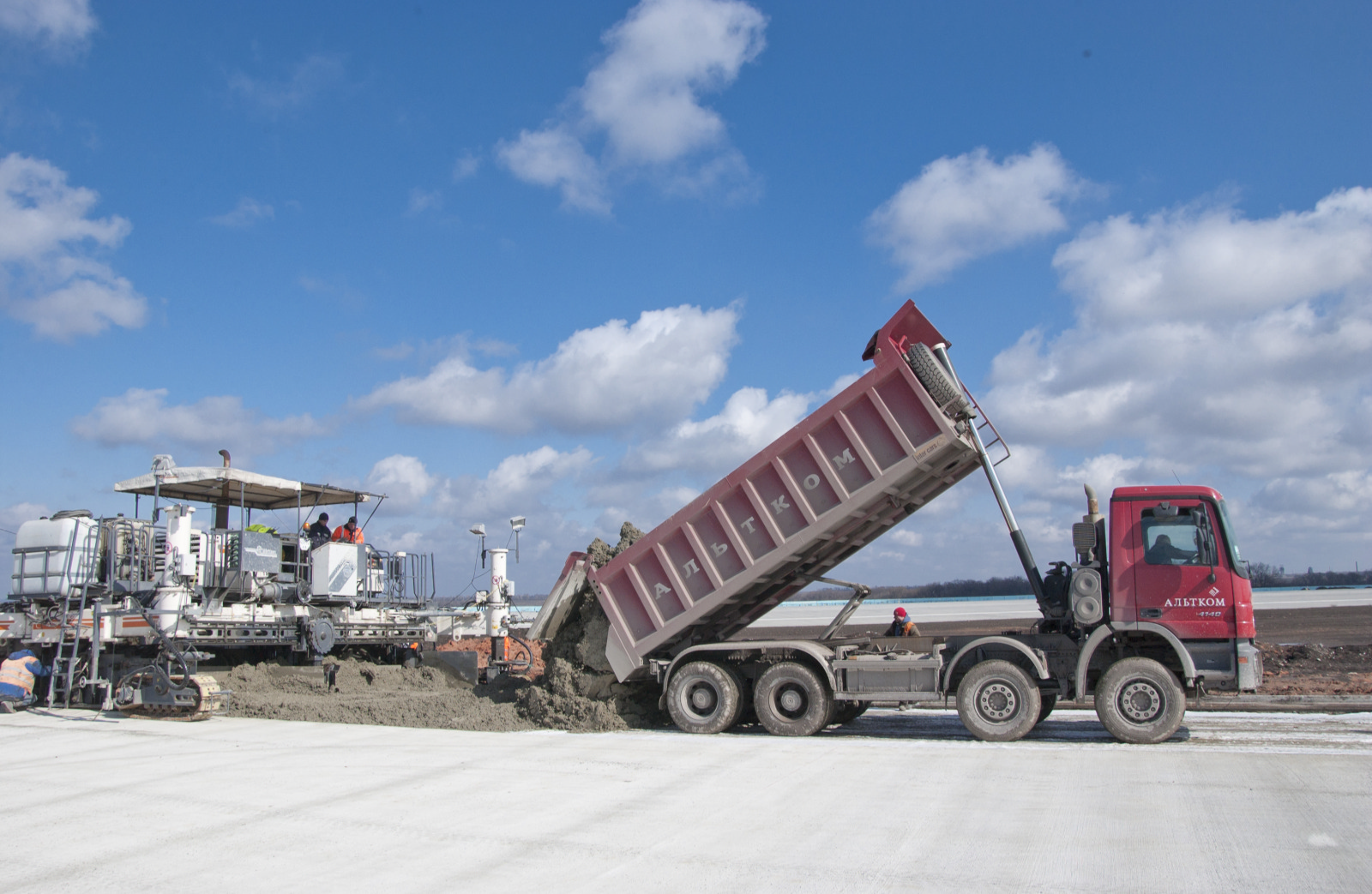 Он также отметил, что строительство обеспечивают мобильные заводы по производству бетона общей мощностью 690 метров кубических бетона в час, работают три бетоноукладчика «Wirtgen»: «SP-1600», «SP-1500» и «SP- 850». Два агрегата укладывают полосу бетона шириной 15 метров и один – 7,5 метра. На сегодня полностью готовы взлетно-посадочная полоса, перрон №2 и пять рулежных дорожек, уложено 1,2 миллиона тонн бетона, создано 550 тысяч метров квадратных покрытия. На объекте работает 400 человек, задействовано 270 единиц техники. Работы ведутся круглосуточно, в три смены.