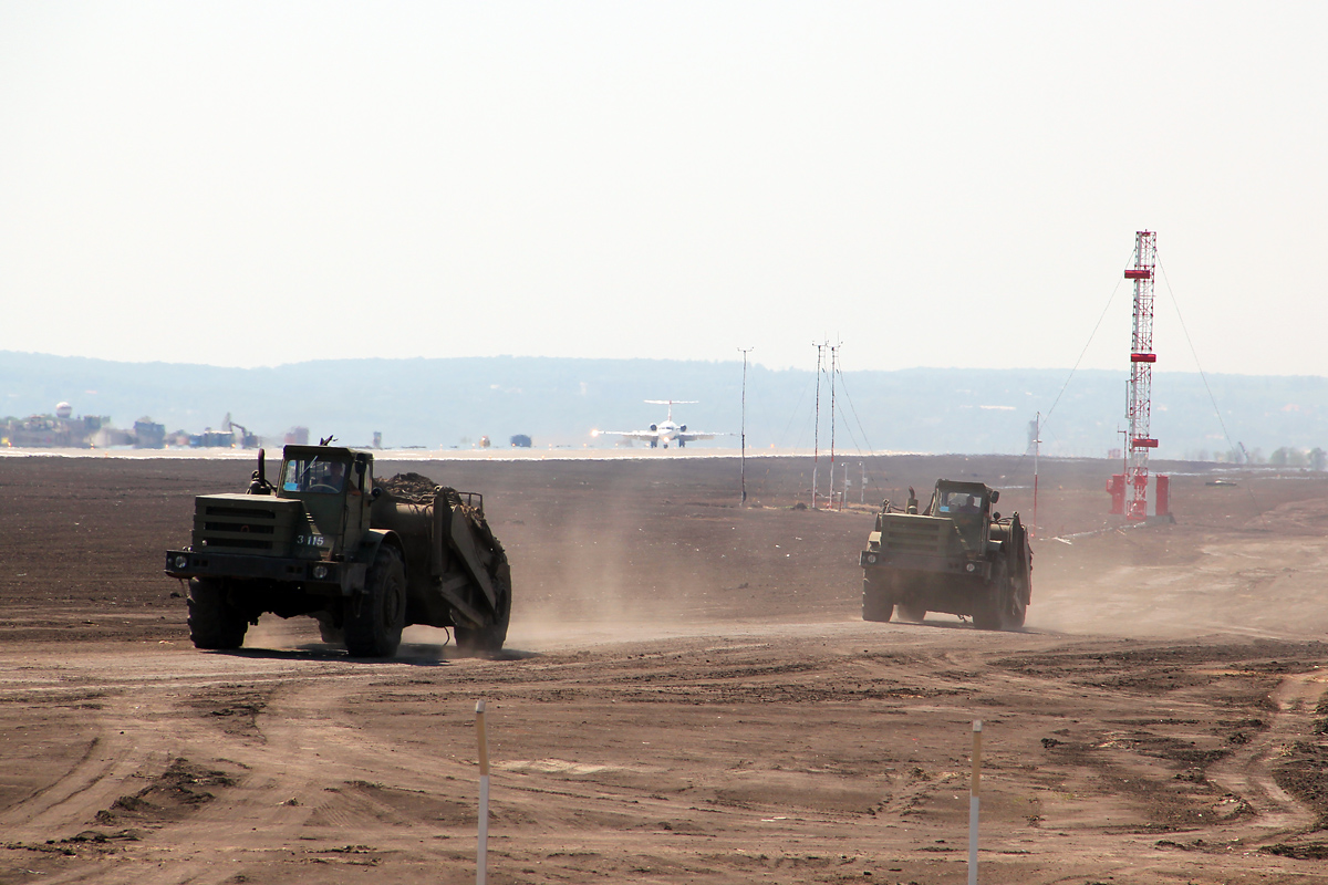 Ничего нового не скажу, Avianews держит в курсе. Временный терминал, как я и предполагал, пустой, только киоски как на выставках складируются. Машин на стоянке аэропорта было относительно много. Дул сильный боковой ветер. Самолёты на посадке прилично шатало, они подлетали немного боком. Поле вокруг полосы уже идеально ровно разровняли и засевали траву. Забора со стороны Федорцов ещё нет, только столбы. Огни подлёта почти доустанавливали, но работали сегодня от генератора. Как только самолёт становилось видно, запускали генератор и фонарики светились.