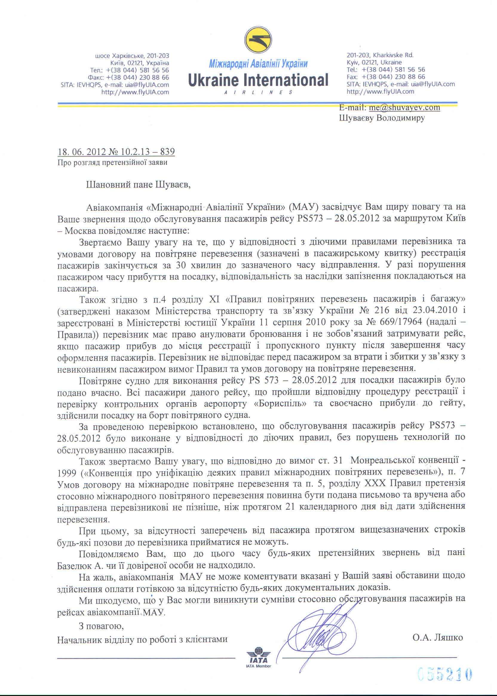 Від імені авіакомпанії «Міжнародні Авіалінії України» (МАУ) засвідчую Вам щиру повагу та повідомляю, що Вашу заяву розглянуто.
