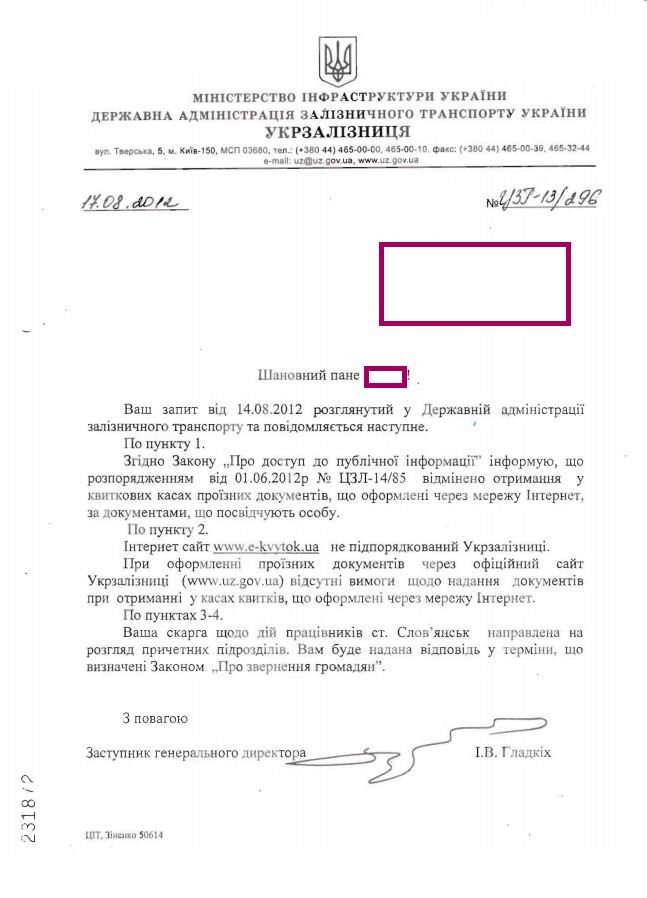 4.Чому квитковий касир станції Слов’янськ (в зв’язку з реконструкцією працює всього одна каса в пересувному вагончіку) при викупі купленого через мережу Інтернет квитка (бланк замовлення додаю) близько 23-00 13-08-2012 року, вимагала від мене пред’явлення паспорту та ОБОВ’ЯЗКОВОГО зазначення на додатковому бланку моїх особистих даних, а саме – номер та серію паспорту, коли там ким був виданий, АДРЕСА РЕЄСТРАЦІЇ???