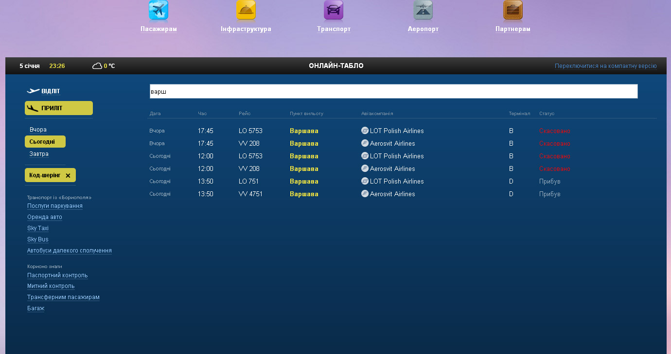 Самолет Аэросвита застрял в Варшаве в пятницу. Вчера вылетел, но не прилетел. Сегодня был отменен один рейс на вылет из Борисполя и два рейса на прилет из Варшавы.