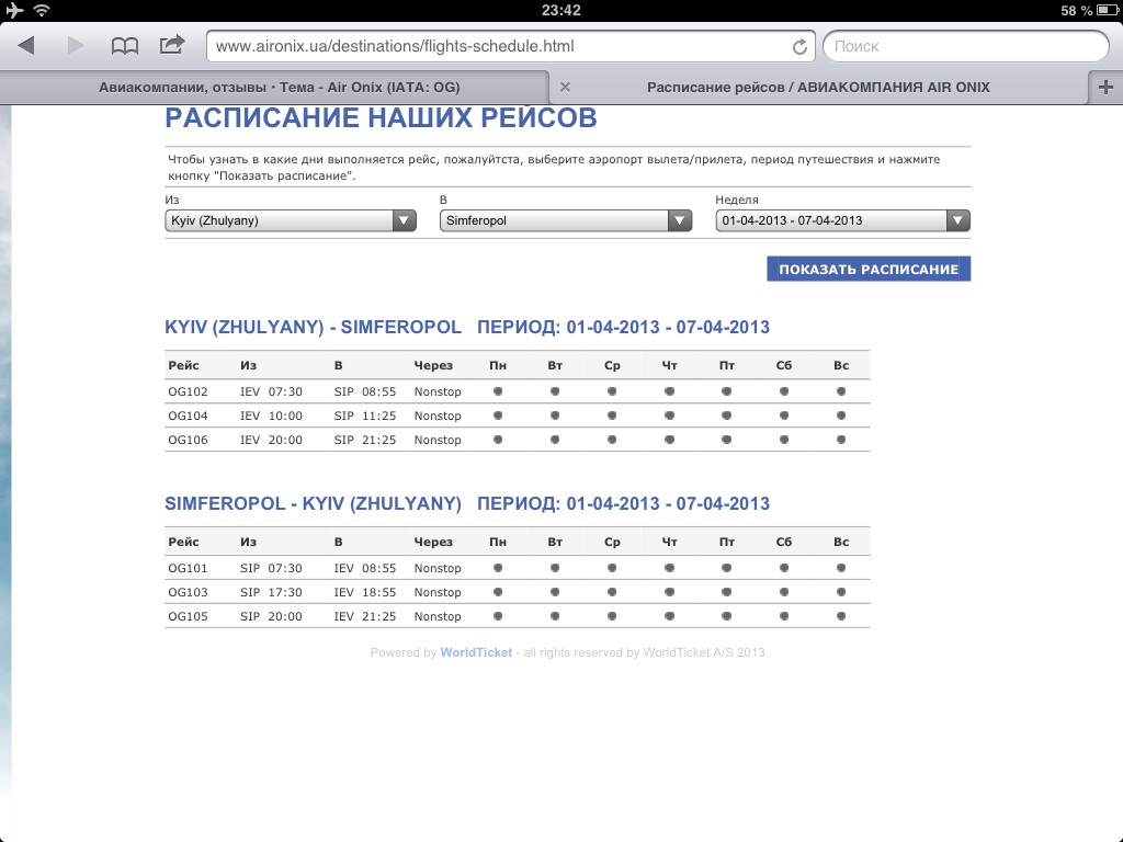 Предположим в воскресенье, в 7:30 один борт уходит из SIP (аннексирован Россией) в IEV (OG101), второй летит навстречу (OG102).