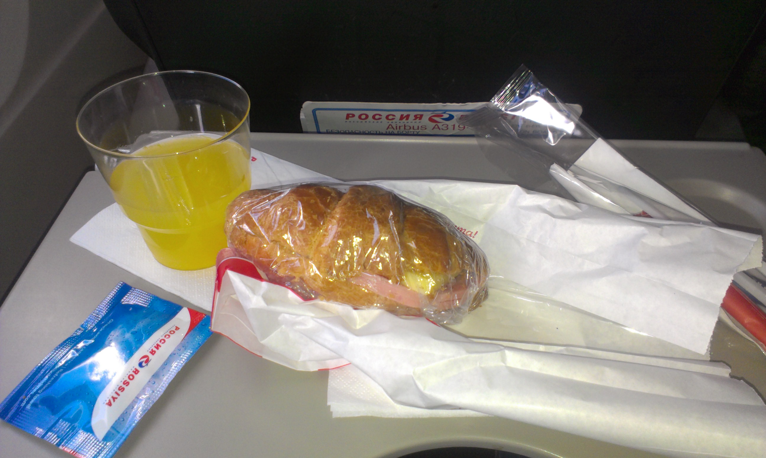 Минут через 15 раздали бутерброд-круассан (сыр, ветчина, листик салата) и чай/кофе.