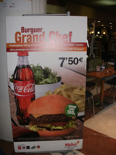 У кафешках можна саме дешеве щось взяти від 7,50 євро, це буде який бюргер фастфудівський і кока-кола +пататас фрітас.