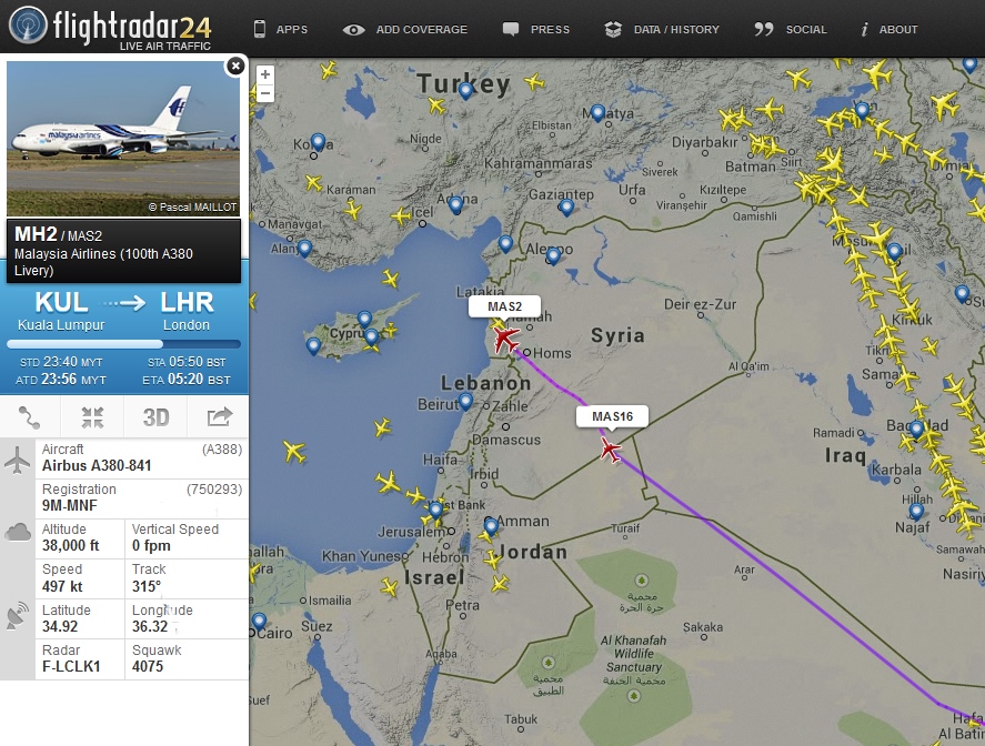 Кроме двух самолётов-гигантов малэйжа, виден один маленький бесстрашный самолёт влетающий в Сирию. Он не в счёт, то были сирийские авиалинии.
