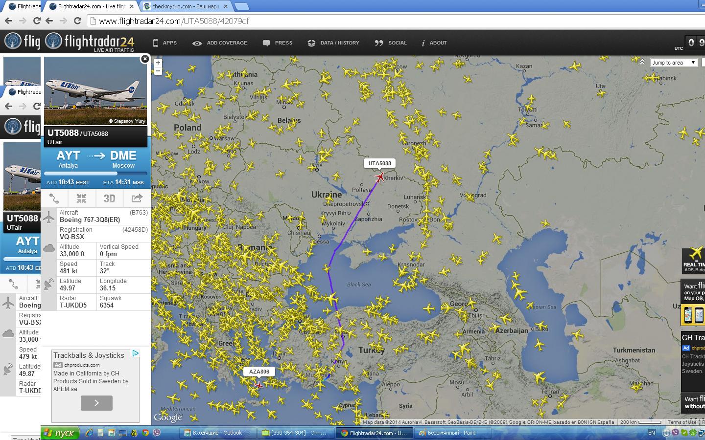 Сейчас над Днепропетровском летит как раз 767-300 ютов VQ-BSX из Антальи. Он же пройдет над Харьковом, по старому-доброму коридору на Москву