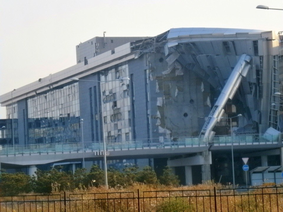 Вот так выглядел фасад нового терминала Международного аэропорта Донецк имени С.С. Прокофьева состоянием на 8 августа 2014 года. Сейчас, насколько я знаю, его не обстреливают из тяжелого вооружения, Грады боевиков, которые его утюжили со стороны Авдеевки, ликвидированы месяц назад. Вполне возможно, что состояние окончательное. Примечательно, что склад ГСМ до сих пор цел, вполне возможно, что боксы со спецтехникой тоже целы.