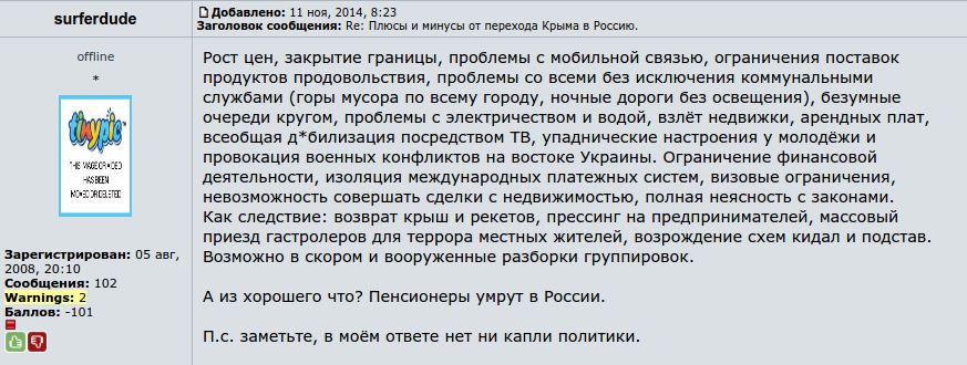 Даже на Севастопольском форуме в последнее время всё чаще можно увидеть разочарование от всего произошедшего. И это при том, что в Крыму нет войны... пока нет
