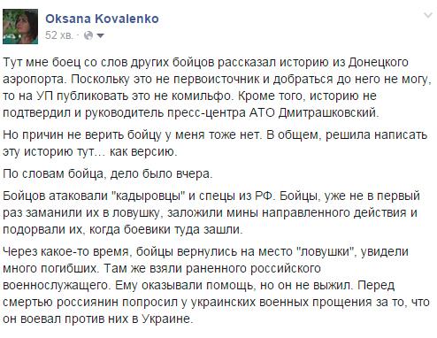 «Перемирие в Донецком аэропорту вызвано тем, что наши хлопцы провели чрезвычайно грамотную, отлично спланированную и хорошо осуществленную операцию, заманившую атакующих в ловушку. В результате, погибло не менее 100 военнослужащих ВС РФ, часть из которых относится к разведывательным частям и подразделениям специального назначения, а часть к северо-кавказским боевикам из Осетии и Дагестана. Огромные разовые потери спецназа ГРУ ГШ ВС РФ, и необходимость быстро захоронить по исламскому обычаю часть погибших боевиков, а также - возможность разоблачения и получения украинской стороной очередных доказательств использования регулярных российских войск на территории Украины, поставили российское командование в чрезвычайно щекотливое положение», - сообщил Арестович.