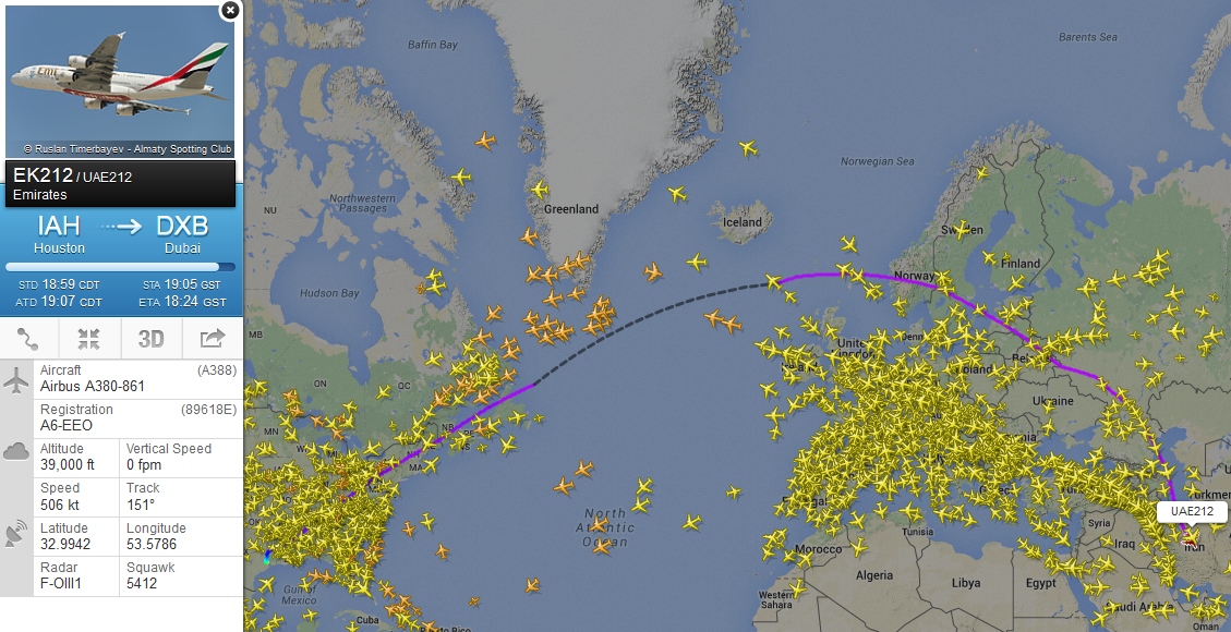 Huston (30' ЮШ) - Dubai (25' ЮШ) на A380. Т.е. Дубай находится даже южнее. Нужно лететь как бы вдоль экватора, но брать на 5' южнее. Получится через Африку, правда. Вместо этого он летит на Север вдоль побережья, потом почти достигает полярного круга, через Фарерские острова (61'), Норвегию, Россию, почти Казахстан и обратно строго на юг.
