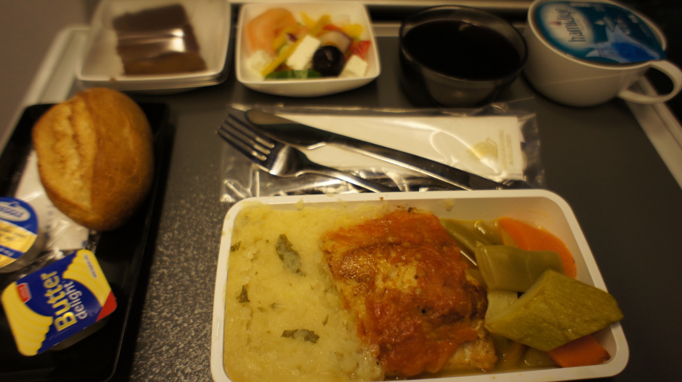 Друге годування за на 10-годинному перельоті, сніданок: яйце, м'ясо (на смак - невідомої тварини, яку, ймовірно, можуть їсти всі релігії), гриби, помідор, булочка, фрукти, напої на вибір