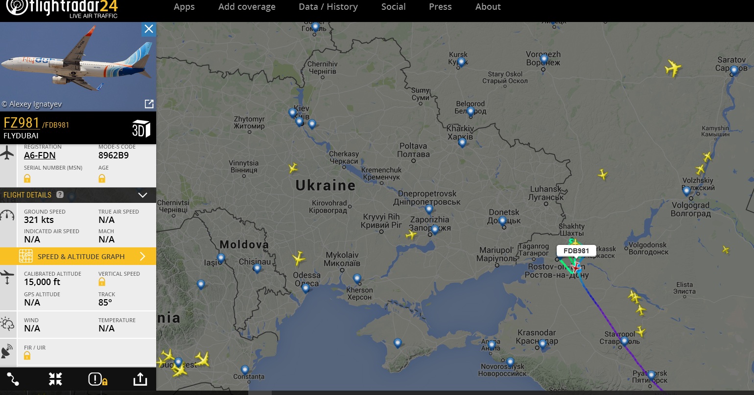 Разбившийся в Ростове Boeing 737 flydubai до катастрофы выполнил рейс из Киева