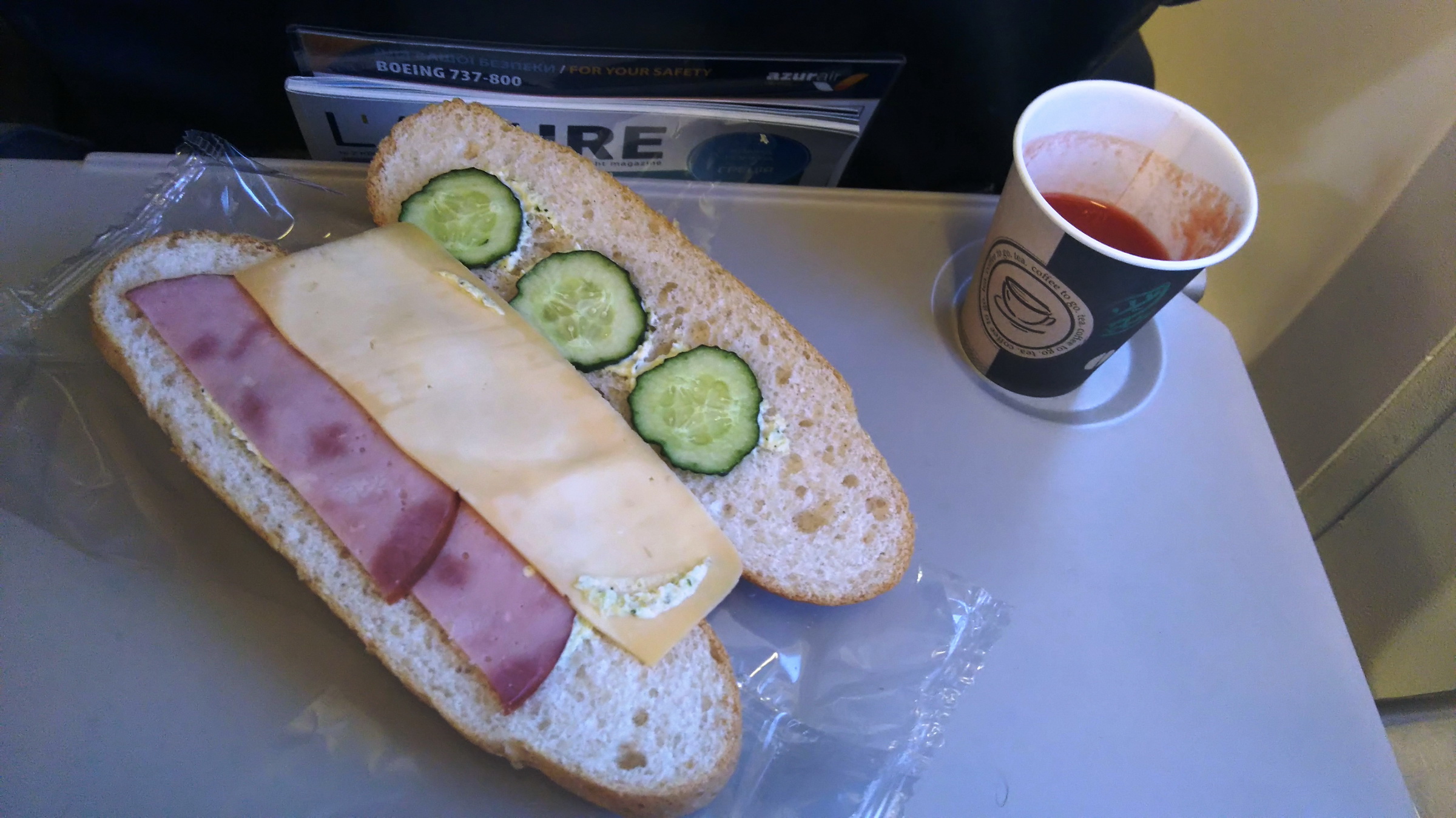 Azur Air, чартер на Анталию, 17.04.2016. Еда не меняется. Булка с ветчиной и сыром, какой то соус и три огурца. В отличии от зимы, когда я летел на Хургаду, добавили ветчину, а вместо помидора положили огурец