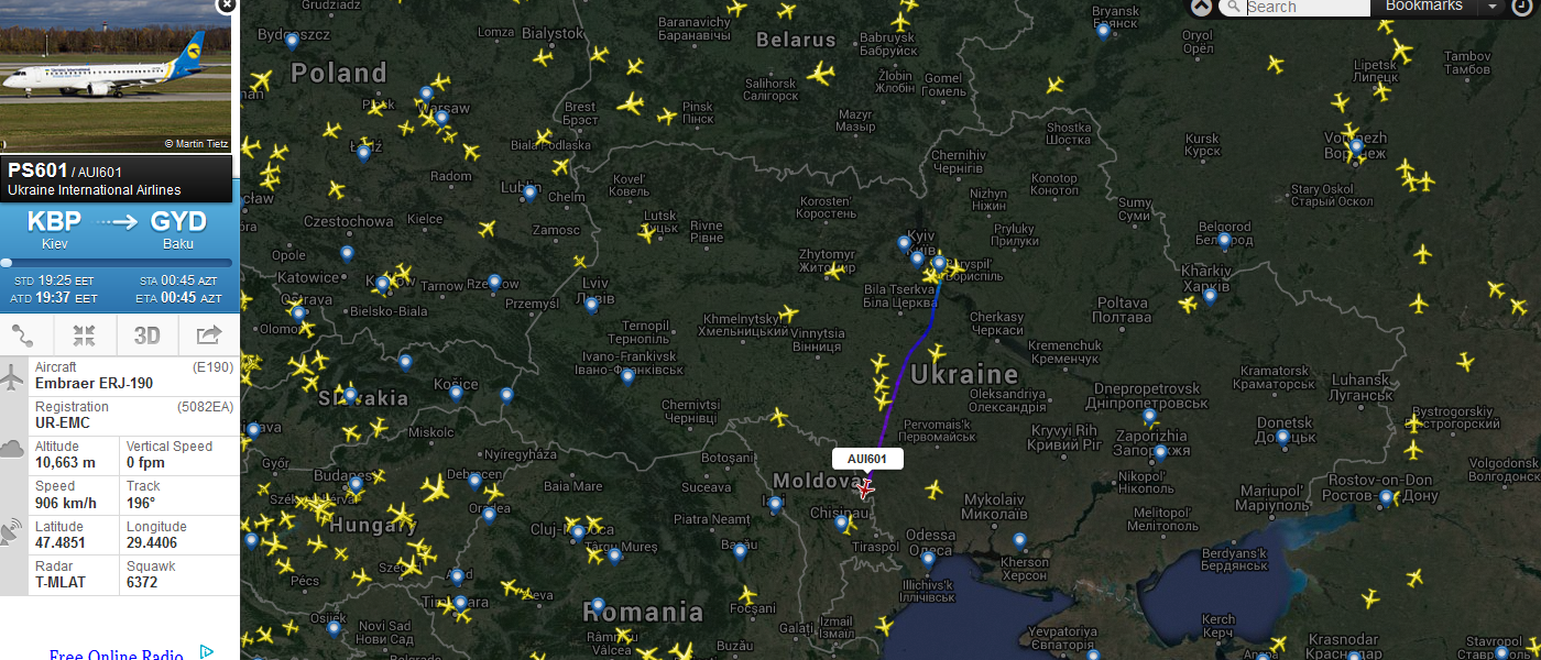 Він оце щойно летів з Києву в напрямку Мінську, а потім на межі Мінської області просто зник з екрану.