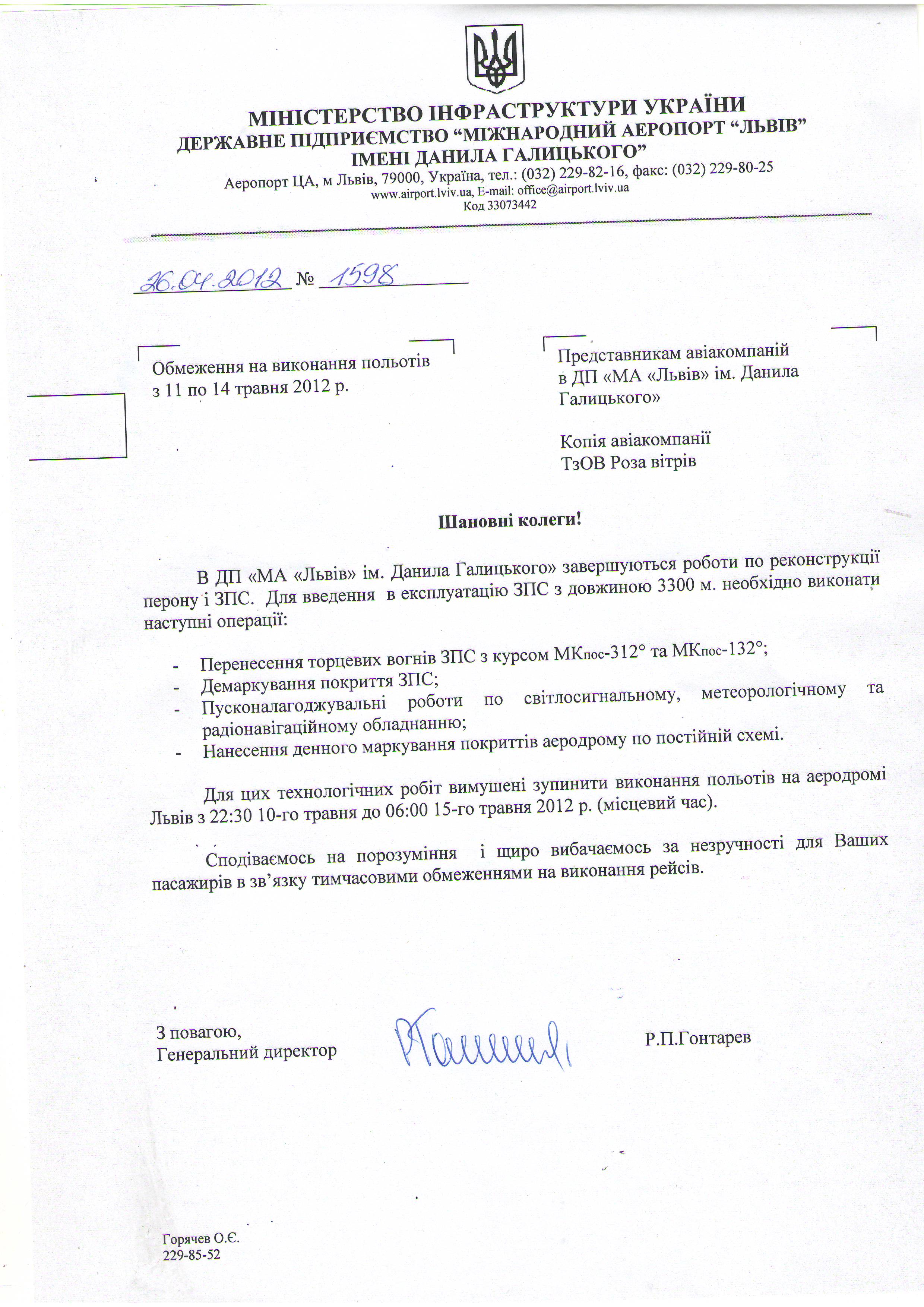 Сообщаем, что в связи с завершением реконструкции взлётно-посадочной полосы, аэропорт «Львов» с 11 по 14 мая 2012 года будет закрыт для всех рейсов.