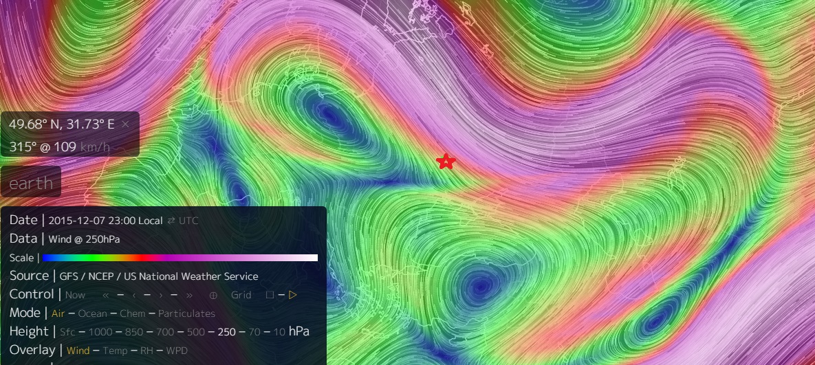Похожая ситуация с ветром и бизнес джетом. Идет через Беларусь и строго по стриму. На карте ветра красной звездочкой обозначен Киев.