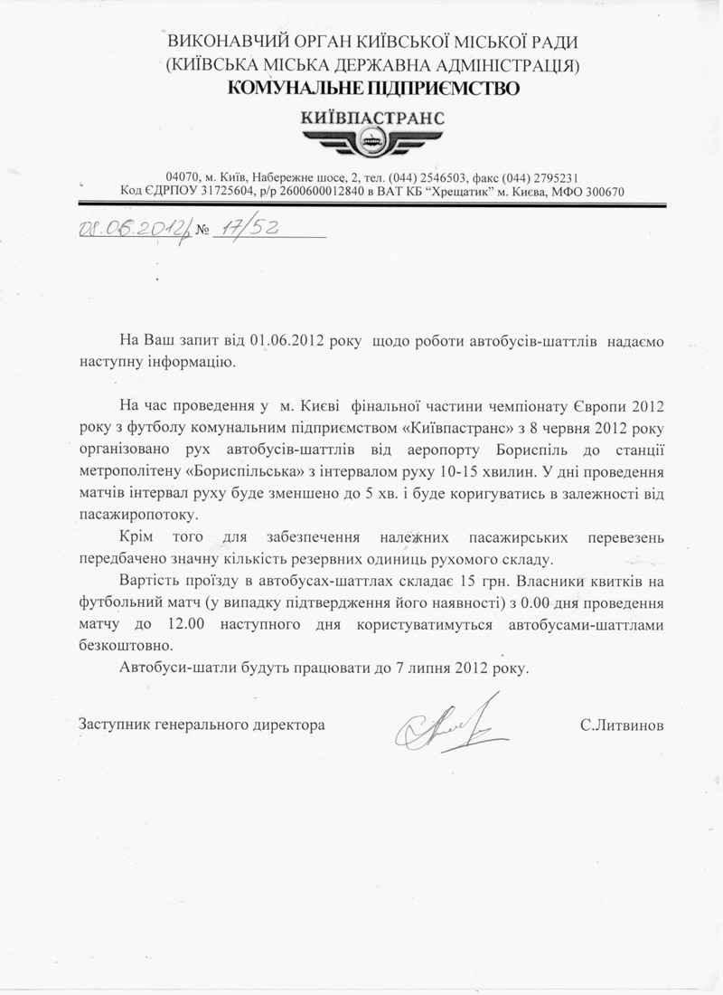 На період проведення фінальної частини Чемпіонату Європи з футболу «Евро-2012» окрім Sky Bus, Sky Taxi і регулярних міжміських рейсів ви можете скористатись спеціальними шатлами КП «Київпастранс».