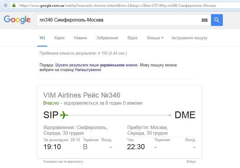 вот только Гугл почему-то не верит. И показывает, что конкретно этот самолёт прибыл в 23:32, и опоздал на целый час и две минуты. Время указано местное, в Крыму увы и ах, тот же часовой пояс, что и в Москве, да и время отправлений совпадают. Так что же это такое, куда пропал целый час?