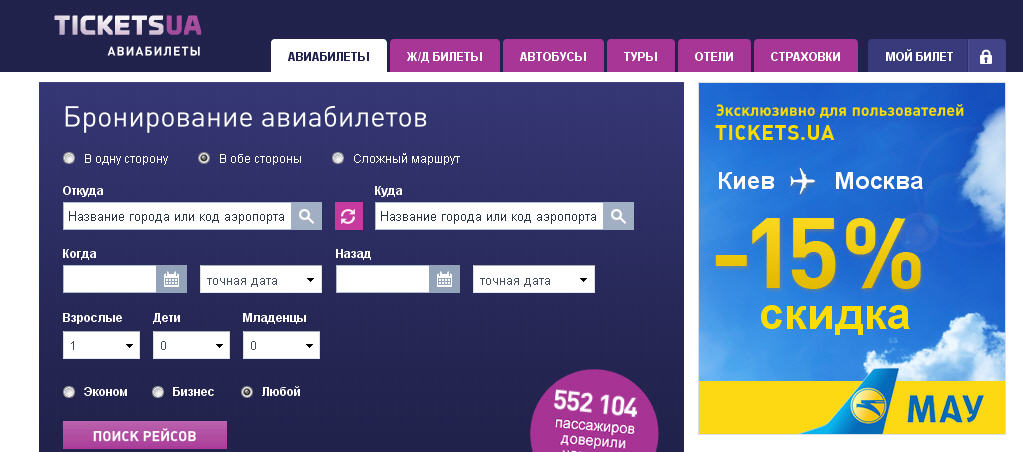А на сайте tickets.ua тем временем думаю, что это скидка только для их покупателейSentry писав:МАУ предлагает билеты из Киева в Москву и Питер со скидкой 15%, вылет до 15 марта. Не густо, но все же. Москва от 1712грн, Питер от 2832 грн РТ.