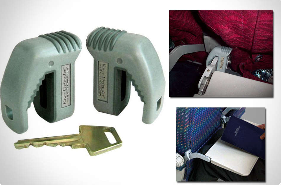 Высоким людям в этой жизни частенько бывает тяжело, так как ноги или, скорее, колени банально некуда деть. Постоянно ощущаю это на себе в самолетах, автобусах, поездах. Но особенно сложно бывает именно в самолете, так как у кресел там уж очень свободный ход и если передний сосед откинется, то приходится буквально обхватывать спинку коленями. Есть несколько вариантов решения проблемы, большинство из которых в 90% случаев не помогают. Да-да, даже очень вежливую просьбу полностью не откидывать кресло люди в большинстве случаев игнорируют, возомнив себя бессмертными. Придется использовать технические средства, вроде Knee Defender. Простейшая штука, на самом деле, а жизнь может облегчить очень сильно. Она представляет собой пару мощных зажимов, которые цепляются за металлический шарнир откидного столика и препятствуют работе механизма, который отвечает за изменение положения спинки переднего кресла. Прицепил такую штуку, сосед подергается-подергается, пытаясь откинуть кресло, решит, что механизм сломан и прекратит свои попытки, после чего можно убирать Knee Defender и возвращать столик обратно. Да, далеко не всегда эту штуку получится использовать, но хоть что-то.