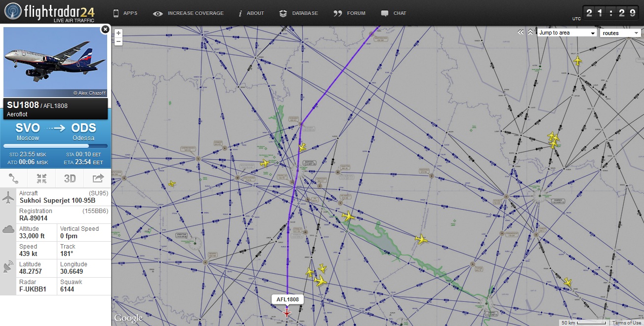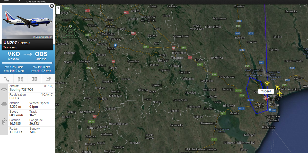 В момент, когда писал АФЛ еще был в Белоруссии, а Татарстан не светился. А маневры Полета как объяснить?AQS писав:Правителсьтвенный борт Татарстана сейчас как раз шпарит на Кировоградщиной. Аэрофлот из Москвы в Рим над Луцком...UR-SAN писав:Ни одного российского самолета не видно над Украиной. Даже Полет из Мюнхена в Воронеж шпарит через Беларусь...