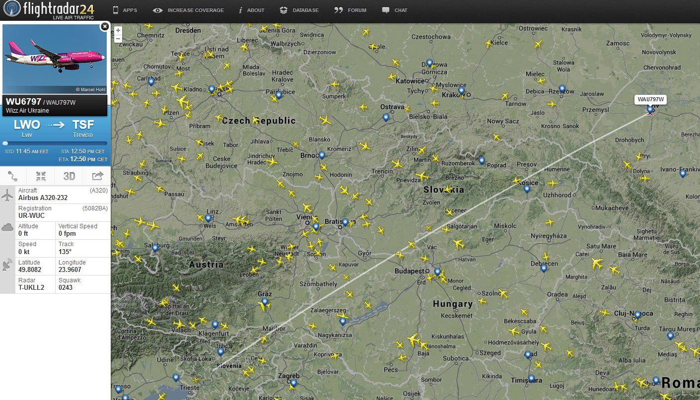 Правителсьтвенный борт Татарстана сейчас как раз шпарит на Кировоградщиной. Аэрофлот из Москвы в Рим над Луцком...UR-SAN писав:Ни одного российского самолета не видно над Украиной. Даже Полет из Мюнхена в Воронеж шпарит через Беларусь...