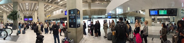 На Скайбас, говорите, нельзя онлайн билет купить? На фото--очередь за билетами на RER--электричку из Шарля де Голля в город. Автоматы--в дальнем левом углу, и в кадре только часть очереди, точнее--одной из нескольких таких же очередей. Стоял дольше, чем на паспортный контроль.