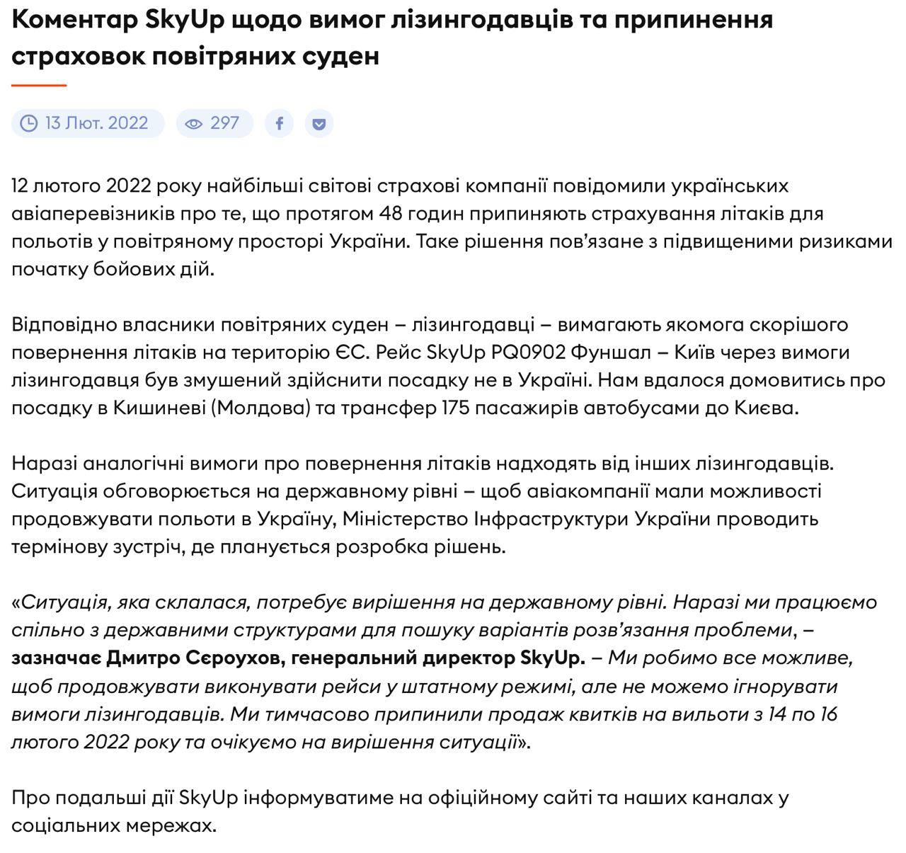 Авиакомпания сообщает, что крупнейшие мировые страховые компании сообщили украинским авиаперевозчикам, что в течение 48 часов прекращают страхование самолетов для полетов в воздушном пространстве Украины. И требуют от украинских авиаперевозчиков оперативно вернуть самолеты на территорию ЕС.