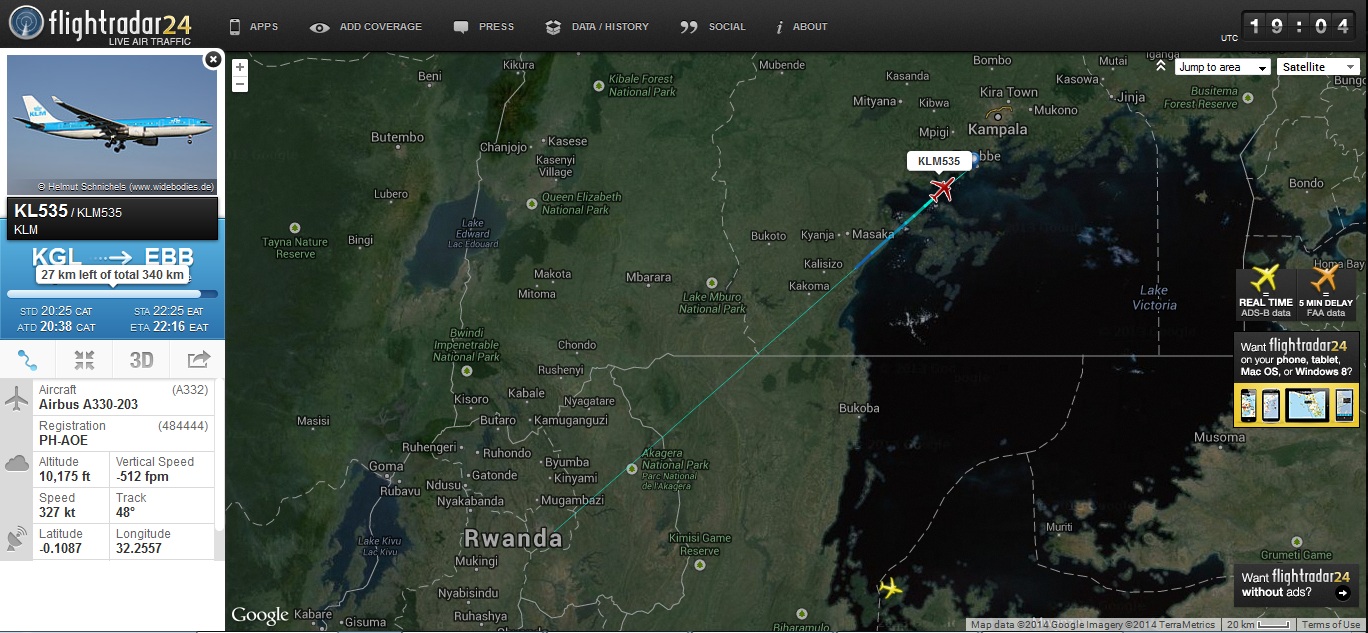 Schiphol (AMS) - Kigali Intl (KGL) - Entebbe Intl (EBB) - Schiphol (AMS)