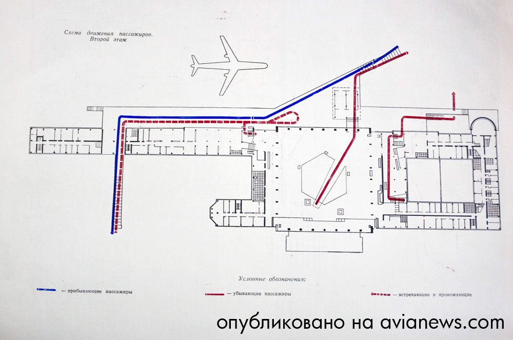 Международные рейсы раньше были в правой части терминала--тут как раз показаны эти "потоки" пассажиров и багажа. Когда-то там стояли таможенные стойки из ДСП, обитые пластиком.Olek писав:Журнал из музея аэропорта