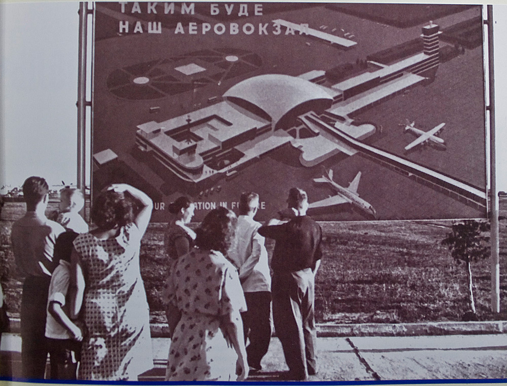 для того, щою якось поліпшити настрій пасажирів та працівників аеропорту, які працювали в тимчасових, малопристосованих приміщеннях, ми зробили мальовничий великий щит макету аеровокзалу, який вже проектувався, а потім будувався, поставили його перед виходом пасажирів з тимчасового аеровокзалу до літаків і великими літерами написали "Таким буде наш аеровокзал"