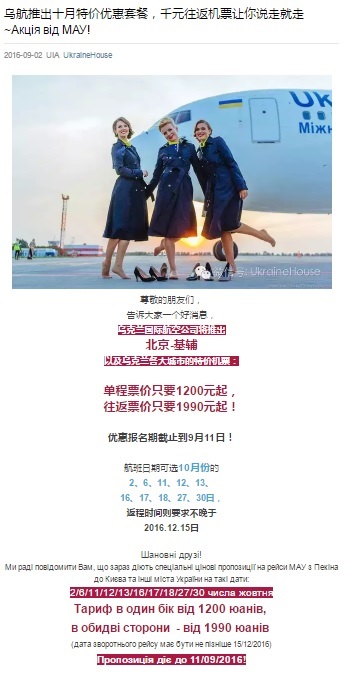 Пост не лише для турагентів - цю рекламу я побачив на сторінці "Українсього Дому" у WeChat (китайський месенджер).Sentry писав:Возможно для китайского рынка это норма? Или этот пост рассчитан на турагентов. Ведь в их рекламе в Украине я такого давно не видел.