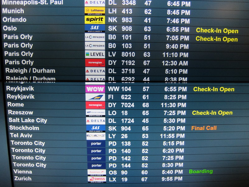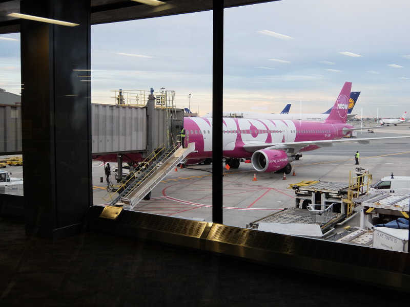 В EWR WOWair обслуживается в терминале B. На выходе из AirTrain в терминал висело табло со списком рейсов, отправляющихся из терминала В. Своего рейса на этом табло я не нашел. Стало немного не по себе :) Пошел в зал регистрации, там на большом табло рейс нашелся. Отлегло. Хотя по дороге висела еще пара экранов и тоже без рейса в Кефлавик. :?