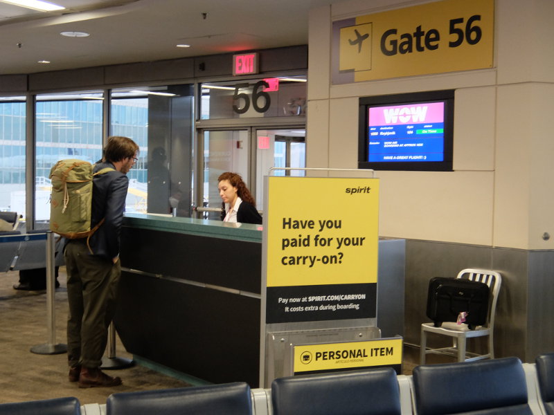 Посадка через телетрап, ничем особенно не запомнилась, кроме лучезарных улыбок стюардес. Размеры ручной клади в минимальном тарифе - 42x32x25 см, но размеры никто не проверял. Пока ждали, поменялся гейт на соседний, но рамку для проверки размеров к новому гейту даже не подвезли. Мне повезло, среднее кресло в ряду оказалось незанятым, не пришлось толкаться локтями с соседом.