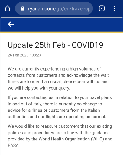 Теоретически это может подпадать под компенсацию по ЕС261 со скидкой 50%. Но в текущих условиях не думаю, что есть много шансов, скорее всего признают текущую ситуацию форс мажором.SergeyL писав: ↑12 березня 2020, 14:19 Мне вчера пришло уведомление, что на одном сегменте (обратном) время переносится на 40 минут позже и предлагает это дело акцептировать. 99%, что я вообще не полечу (мероприятия поотменялись, а просто неделю втычить в Германии и Франции - удовольствие недешевое). Как кто думает, есть ли шансы этот сегмент (а в идеале, оба) как-то монетизировать под шумок? Отменить, на счет перекинуть, или банально перенести на полгода? Вылет туда 16.03, обратно - 22.03.