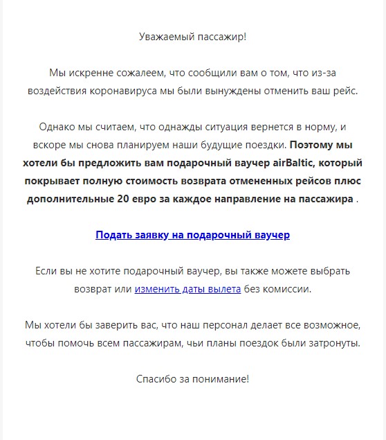 Болтики, как и МАУ, приходят в чувство. После отмены рейсов, изначально прислали форму, где был только перенос дат или возврат. А через несколько дней решили, что вполне можно, вместо возврата, раздать ваучеры. Вот такое письмо прислали сегодня. Теоретически, по 20 евро за 6 сегментов - хороший бонус. Практически, никто не знает, какие цены будут потом, вполне возможно, даже с учетом ваучера, все равно придется доплачивать. В любом случае, если нужна Рига, Визз быстрее и дешевле и из Жулян.