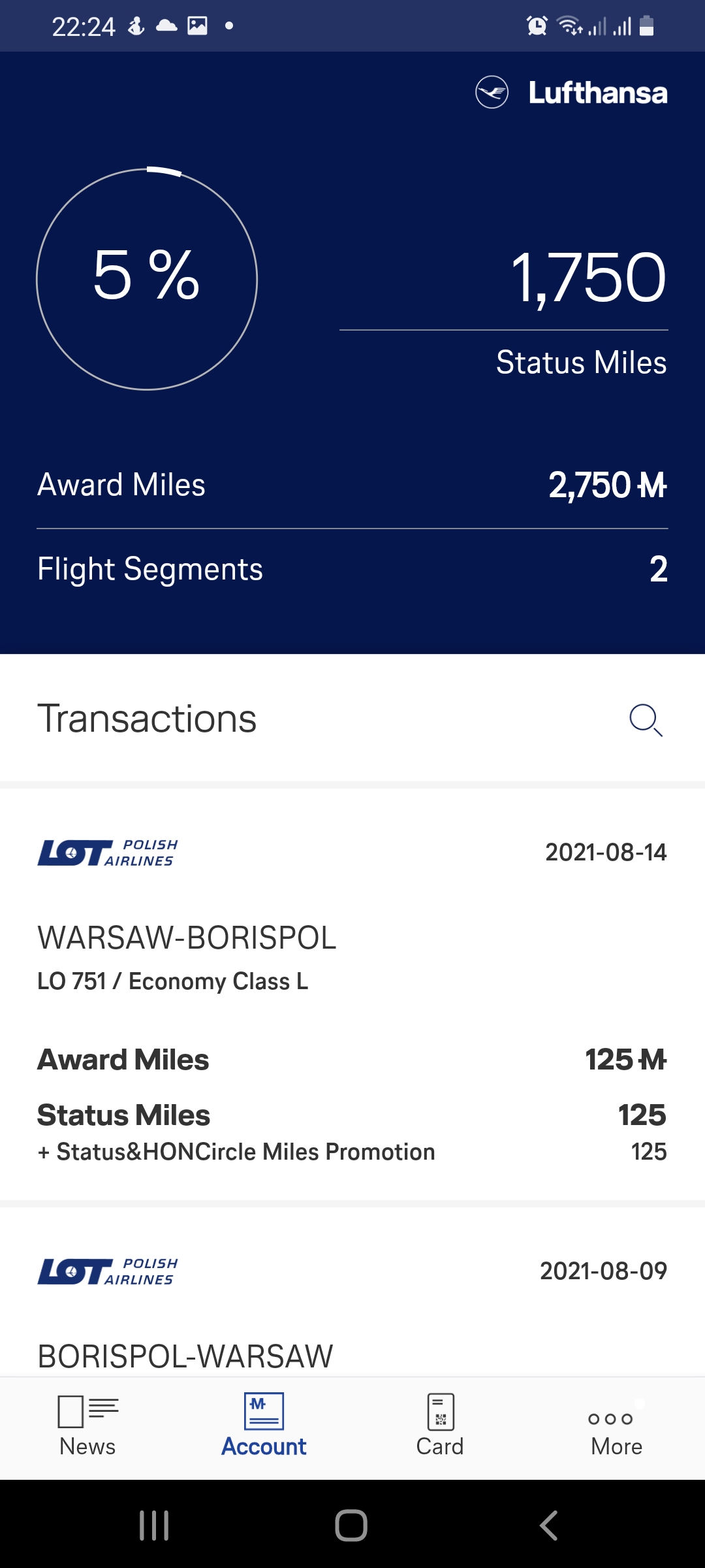 2 This promotion is valid on all flights with the Lufthansa Group (Austrian Airlines [OS], Lufthansa and Lufthansa Private Jet [LH], SWISS [LX], Eurowings [EW], Brussels Airlines [SN], Air Dolomiti [EN], Edelweiss Air [WK]), Croatia Airlines (OU), Luxair (LG) and LOT Polish Airlines (LO) on which status miles and HON Circle miles are awarded.