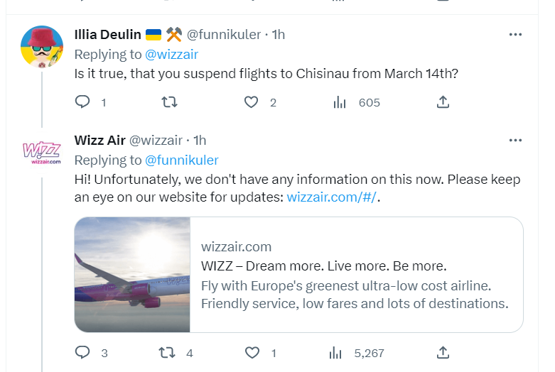 При цьому WizzAir продовжать літати у румунські Ясси, збільшивши кількість рейсів з цього міста. Клієнтам, які мають квитки з або до Кишинева на дати з 14 березня, обіцяють можливість повернути кошти або обміняти квиток.