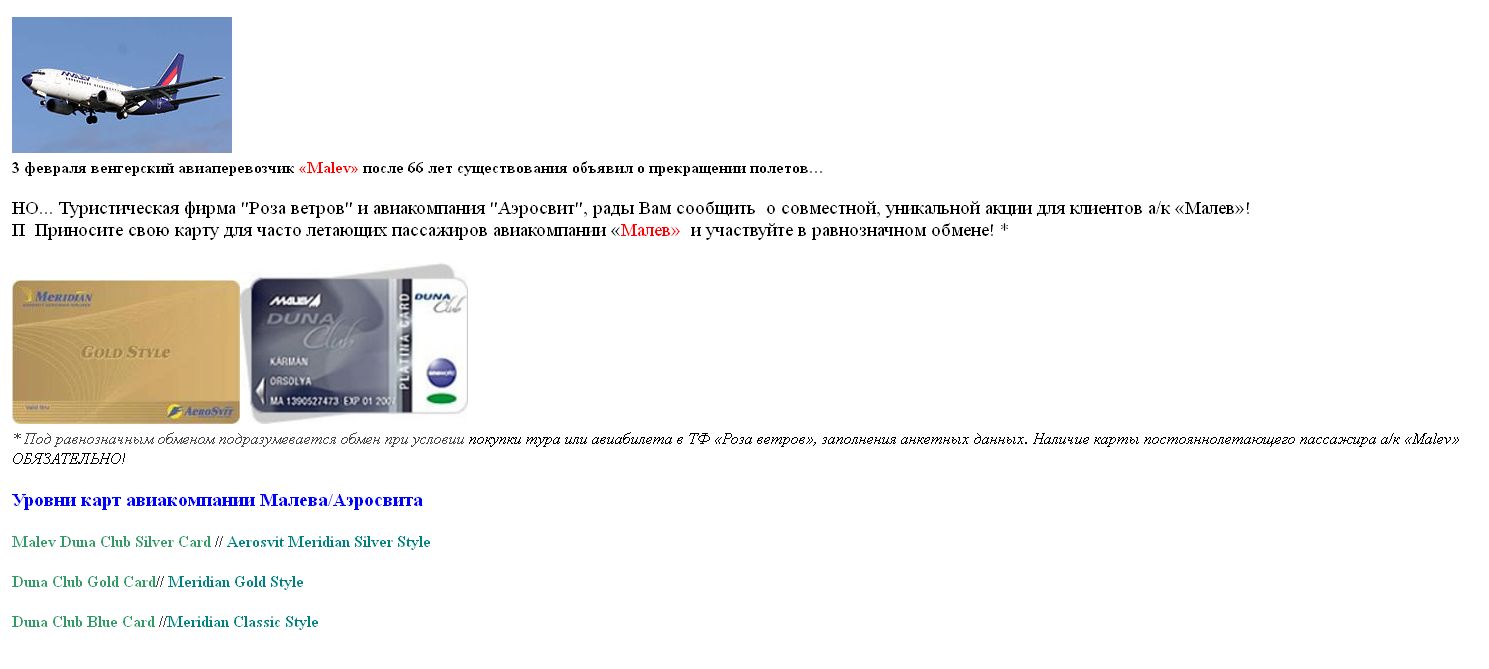 Я был подписан на рассылку Малева раньше, и постоянно получал предложения. (Жалею, что многими не воспользовался--были неплохие).Olek писав:Уже и я получил аналогичное письмо, хотя Малевом никогда не летал и карточки их не имел. Похоже, банальная спам-рассылка от Росачки (лучи добра им).