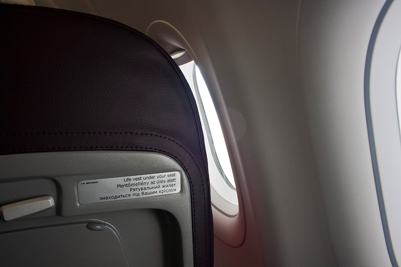 Приоритетников пускают первыми, их место в автобусе отгорожено лентой. Затем в этот же автобус пускают всех остальных. Поехали... Проехав метров 300, встали на летном поле минут на 15. Погода была отличная, солнце припекало. В итоге водитель все же открыл двери, чтобы можно было подышать свежим воздухом. Подъехав к самолету, вначале водитель открыл двери той части салона, в которой располагались приоритетники. Как только они вышли, выпустили всех остальных. В UR-WUC установлены кресла нового образца. Они более тонкие и не откидываются, но благодаря этому увеличено пространство для ног. Сложилось впечатление, что это пространство больше в носовой части салона (примерно на 5 см по сравнению со старыми бортами), чем в хвостовой (больше примерно на 3 см).