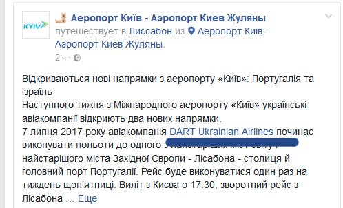 Рейси у столицю Португалії авіакомпанія DART відкриє 7 липня 2017 року. Польоти будуть виконувати один раз на тиждень щоп’ятниці. Виліт з Києва о 17:30, зворотний рейс з Лісабона прибуває до Києва рано вранці в суботу о 4:20 за київським часом, час у польоті приблизно 4 години 20 хв, – повідомляє lowcostavia.com.ua.