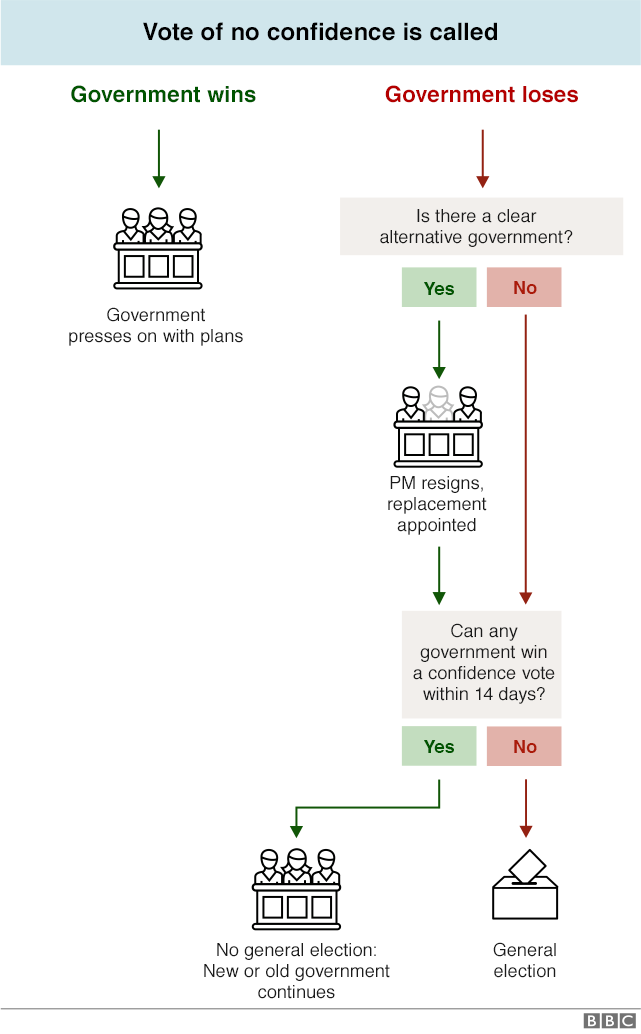 В любой момент оппозиция может проголосовать вотум недоверия правительству. Лидер лейбористов ранее уже говорил, что он выдвинет такое предложение. Если большинство проголосует за вотум о недоверии, тогда будет 14-дневное окно, чтоб нынешнее правительство - или альтернативное правительство с новым премьер-министром - могло выиграть вотум доверия. Если никто не выиграет вотум доверия, тогда последуют досрочные выборы.