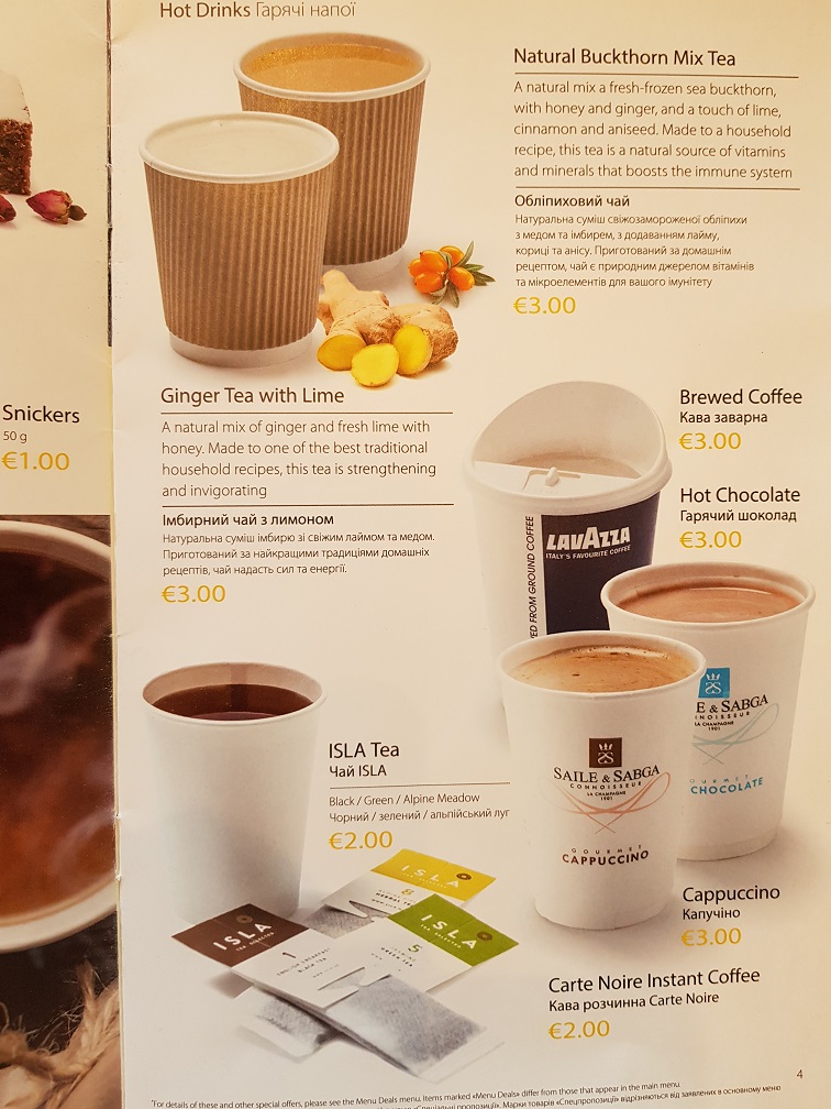 У МАУ новое меню на борту. Теперь есть два горячих варианта, панини остались те же, но убрали весь алкоголь, кроем пива (кто это придумал и зачем - непонятно). Кофе и чай значительно улучшились.