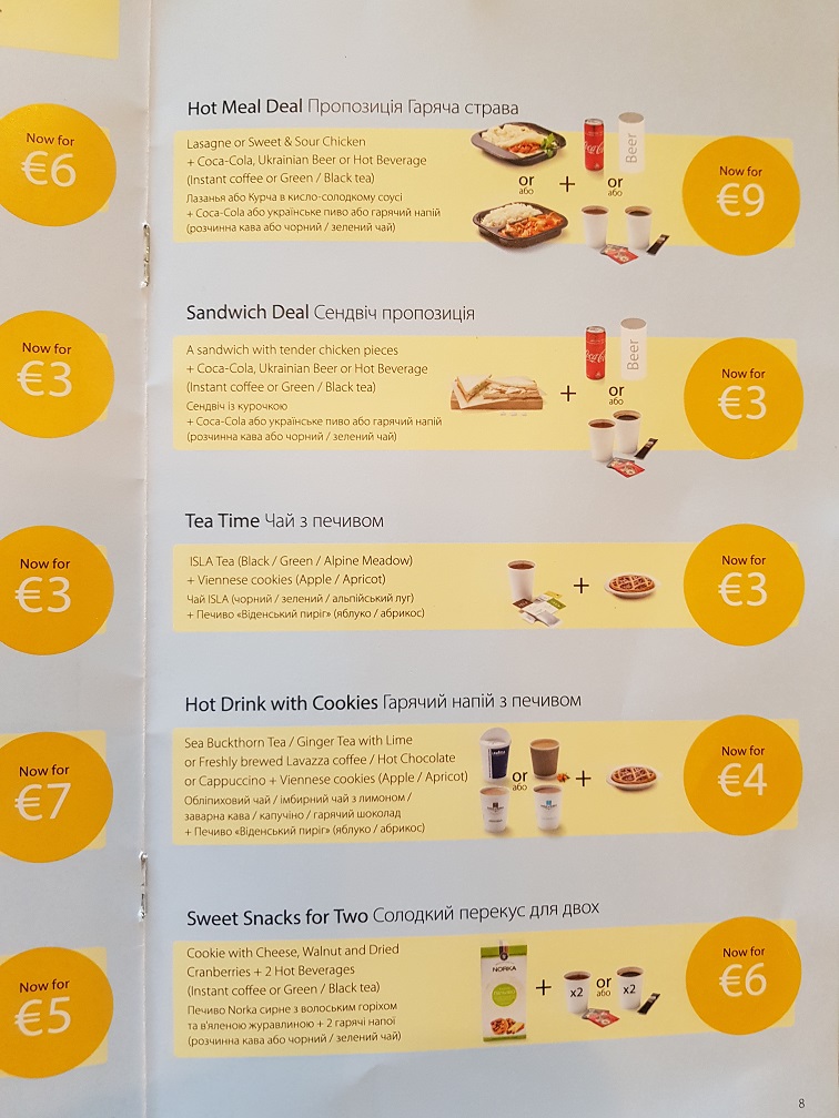 У МАУ новое меню на борту. Теперь есть два горячих варианта, панини остались те же, но убрали весь алкоголь, кроем пива (кто это придумал и зачем - непонятно). Кофе и чай значительно улучшились.