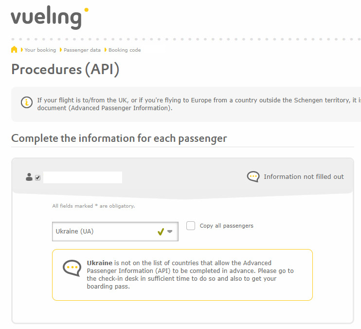 Выдает такое вот предупреждение при выборе паспортов Украины. Если выбирать паспорта ЕС - то позволяет заполнить данные.