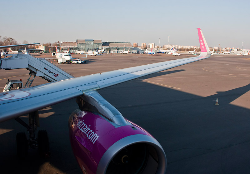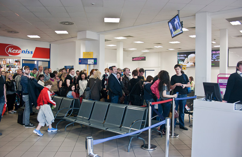 В Жулянах был примерно за 1 час 50 минут до вылета. У стоек регистрации большая очередь. Прогуливаюсь по периметру со знакомой, перемещаю ценные вещи из чемодана в рюкзак и становлюсь в очередь. Впереди 5 человек, но у сотрудниц за стойками постоянно возникают какие-то проблемы. Полчаса - и багаж сдан, взамен выдан чек (раньше выдавали стандартные талоны) с наклейкой о приоритетной посадке. На втором этаже небольшая очередь на контроль. Открыто два окна. Минут 10 - и оказываюсь за рамками. Прохожу мимо таможенников, но в этот раз не трогают. На паспортном конроле пытаюсь использовать белую карту у автомата, но без результата. Автоматы зависли и не работают. Становлюсь в обычную очередь. До вылета по расписанию еще минут 40, но возле выхода на посадку рейса на Катовице уже очередь. В ожидании посадки включаю ноутбук. Wi-Fi работает. Проверил почту, а тут как раз объявили о посадке.